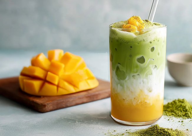 Mango Matcha Ice Latte – A refreshing twist on the classic matcha latte, blending smooth, earthy Japanese green tea with sweet, tropical mango syrup over ice. Perfectly balanced, lightly creamy, and naturally energizing, this iced treat is a summer favorite for a cool, vibrant pick-me-up.