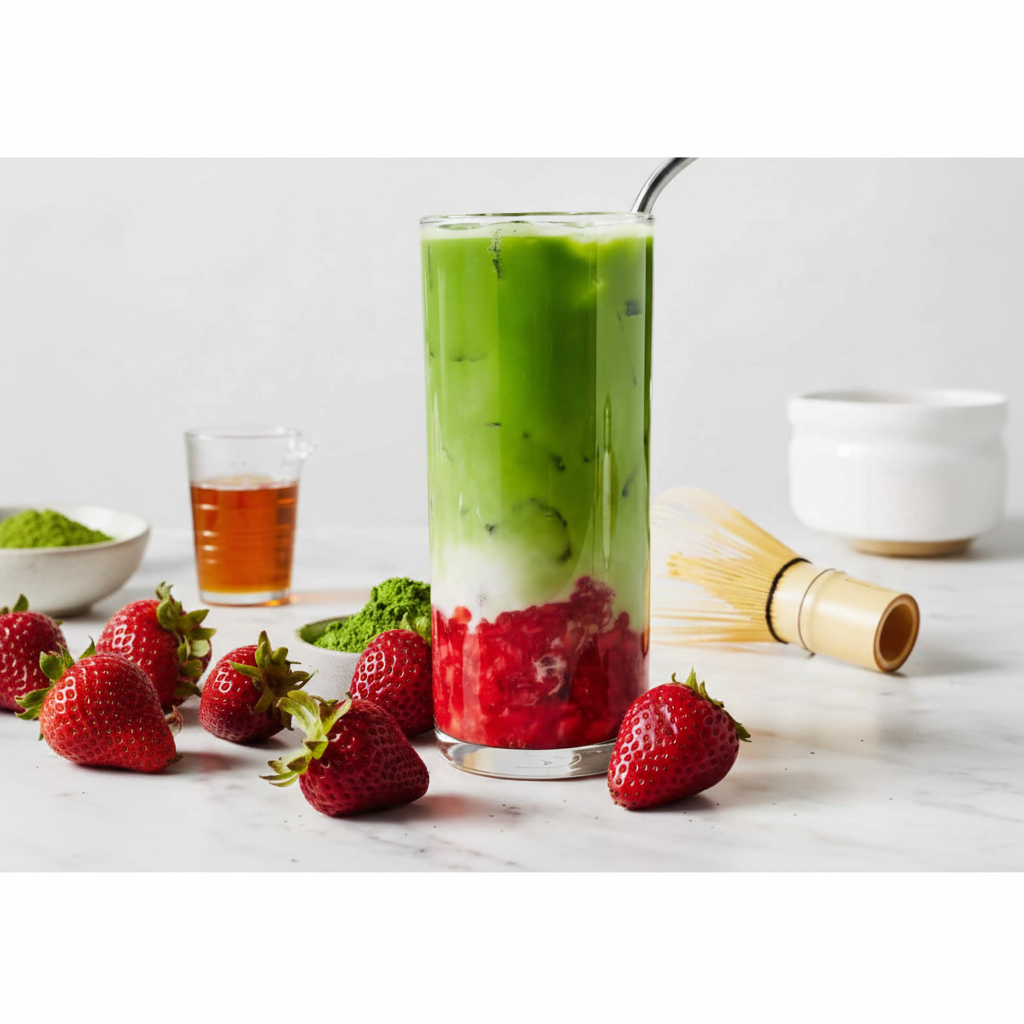 A refreshing layered latte that’s as beautiful as it is delicious. Sweet, juicy strawberry purée meets smooth, creamy milk and a bold shot of earthy premium matcha poured over ice. The result is a perfectly balanced drink — fruity, lightly sweet, and gently energizing.