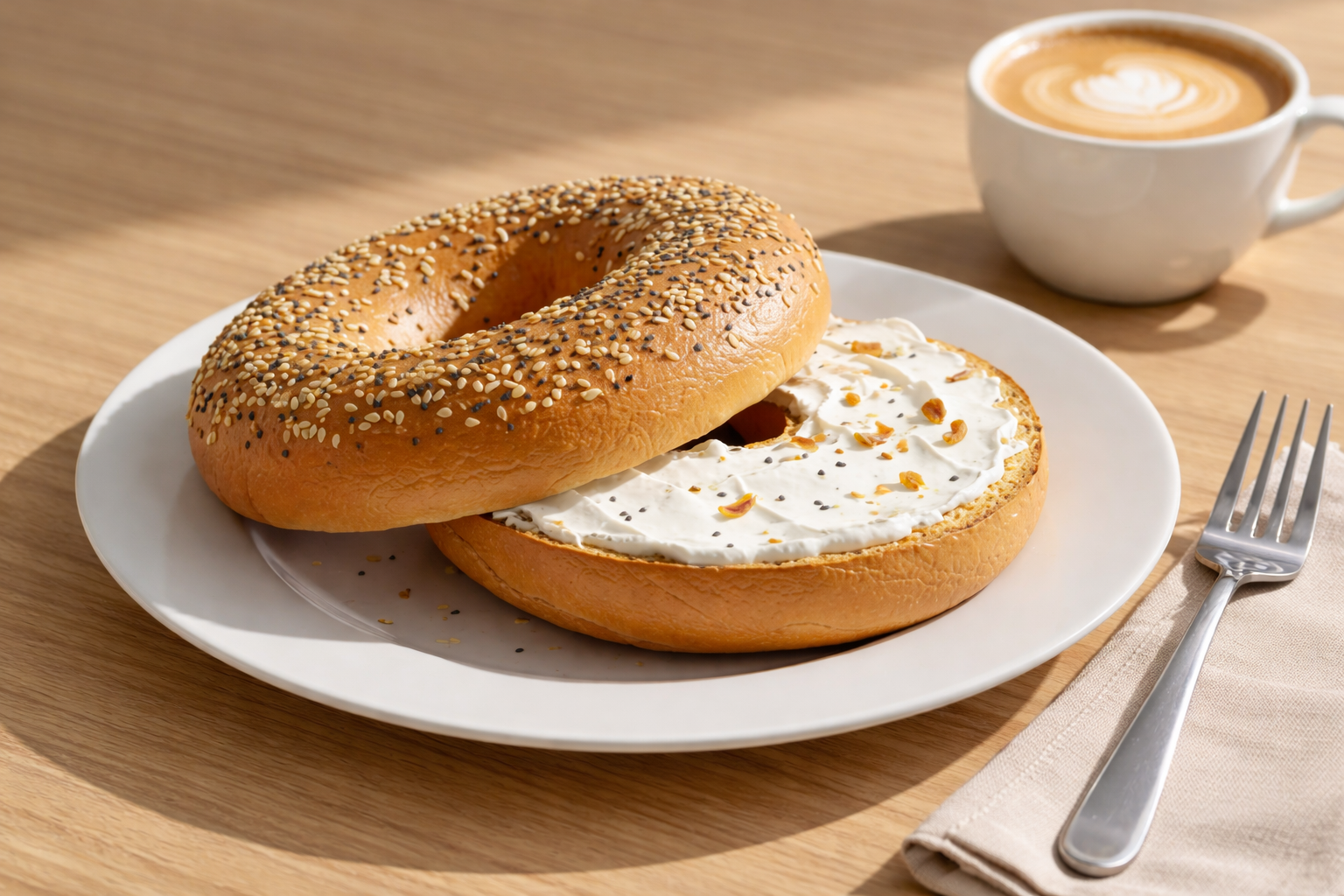 A classic café staple, this dish features a freshly sliced Plane or Sesame bagel generously spread with smooth cream cheese. The bagel is lightly toasted to create a crisp exterior while maintaining a soft, chewy interior.