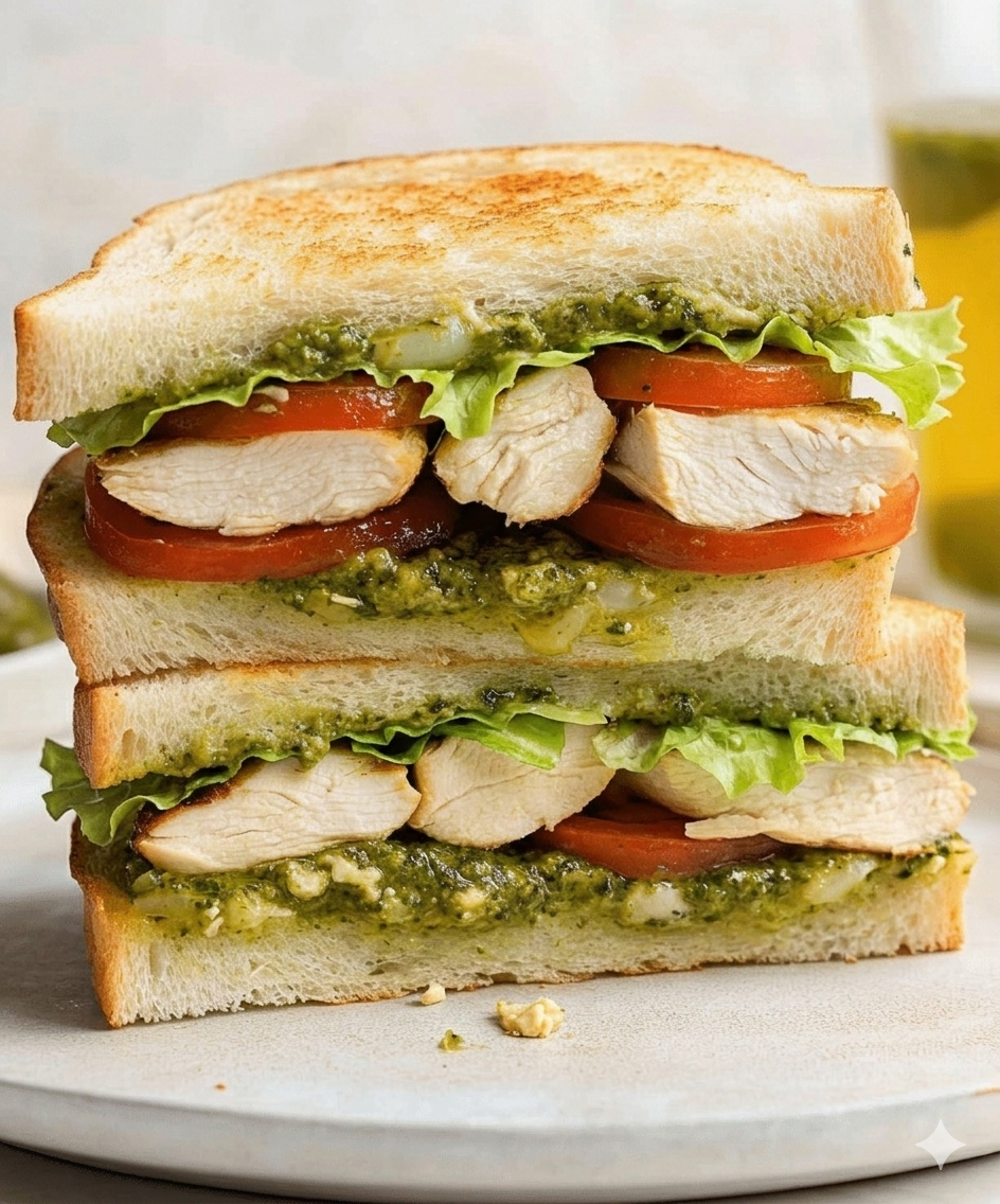A hearty, toasted Pesto Chicken Sandwich on Sourdough, stacked high with fresh tomatoes, basil-pesto, and now a crisp layer of fresh lettuce on a rustic plate.