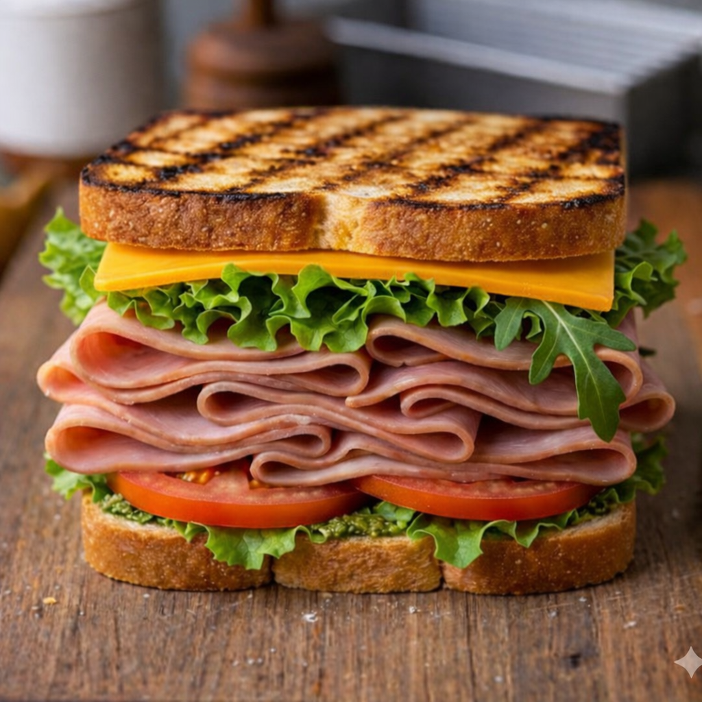 five hearty layers of savory smoked meat, crisp lettuce, and fresh tomato on thick-cut toasted farmhouse bread.