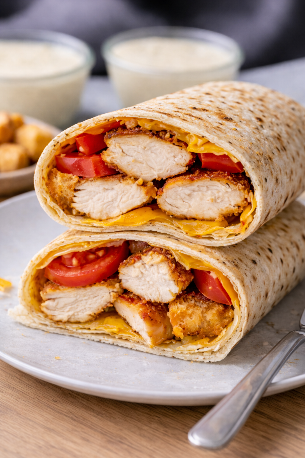 A grilled wrap filled with crispy breaded chicken, melted cheddar cheese, fresh tomato, and creamy dressing for a warm and satisfying bite.